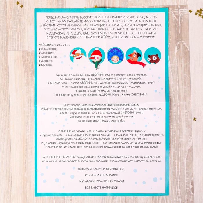 Выберите ведущего и распределите роли между участниками. Читайте сказку и выполняйте все действия, которые описывает ведущий. А весёлые ободки для каждого персонажа добавят неповторимого новогоднего настроения! Также внутри вы найдёте 2 забавные игры для нетрезвой компании.