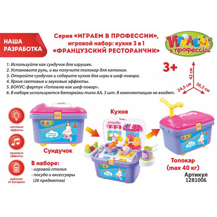 Игровой модуль кухня-каталка 3 в 1 «Французский ресторанчик», 26 предметов, световые и звуковые эффекты, БОНУС - фартук