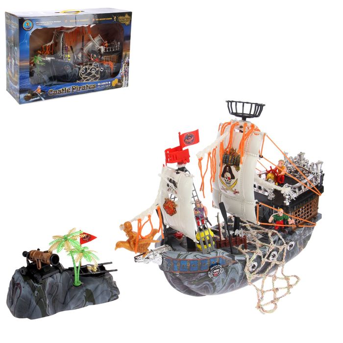 Красочный корабль с первых секунд привлечёт внимание ребёнка, а разнообразные дополнительные предметы не дадут ему скучать. В набор входит всё необходимое для увлекательных сюжетно-ролевых игр в пиратов: полная оснастка судна, остров с хижиной, сундук с сокровищами, фигурки капитана и матросов.