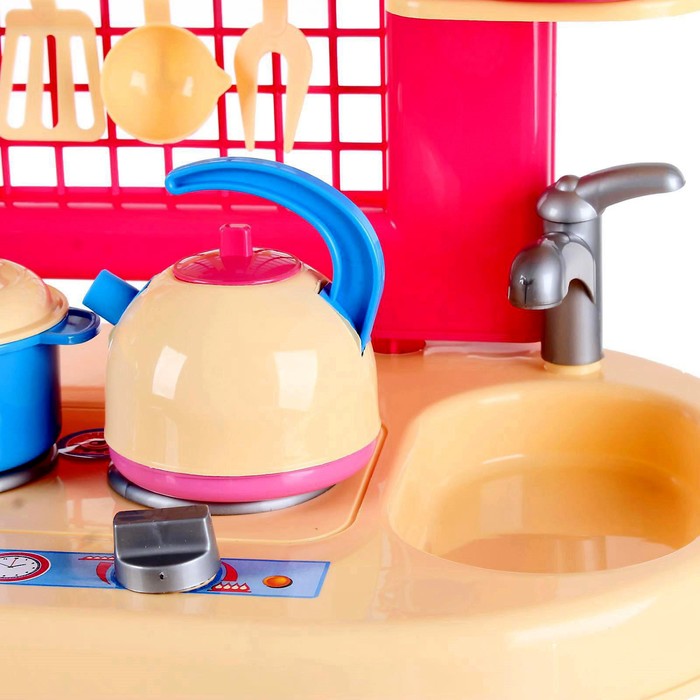 Малышка любит помогать маме? Подарите ей яркий гарнитур «Моя первая кухня», от которого девочка придёт в невероятный восторг! На рабочей поверхности находится плита с двумя конфорками, раковина с краном и небольшое пространство для посуды. Для хранения кухонных принадлежностей есть две полочки под вытяжкой и крючки для лопаток.