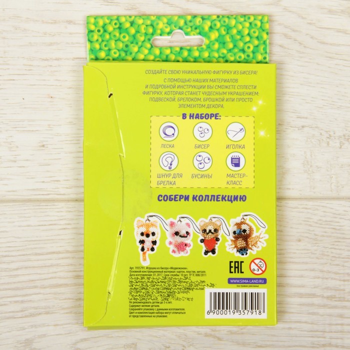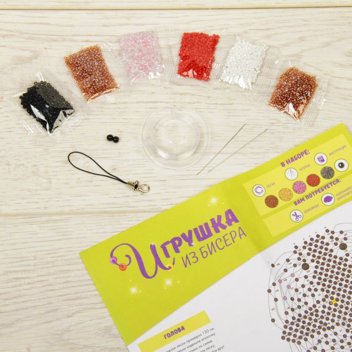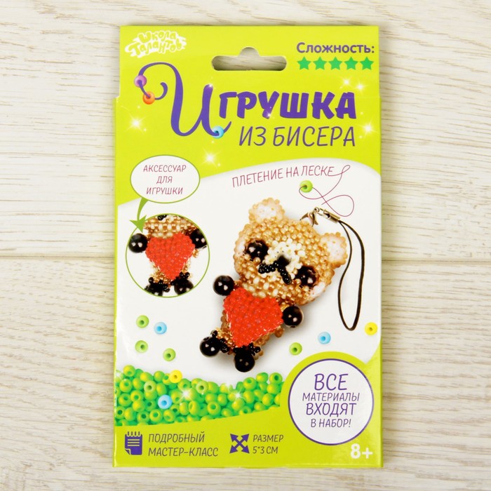 С этим набором для творчества ребёнок создаст из мягкой проволоки и цветных бусинок небольшую фигурку-сувенир. Готовая игрушка станет ярким брелоком для телефона или украсит связку ключей.