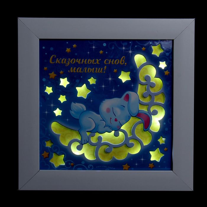 Днём это душевная картина, которая привнесёт в интерьер тёплые нотки. Ночью же одним нажатием кнопки она превращается в оригинальную лампу, которая своим мягким светом создаст неповторимый уют. Интерьерный светильник "Сказочных снов", 22,5 х 22,5 см не требует подключения к розетке и работает от двух AA батареек.
