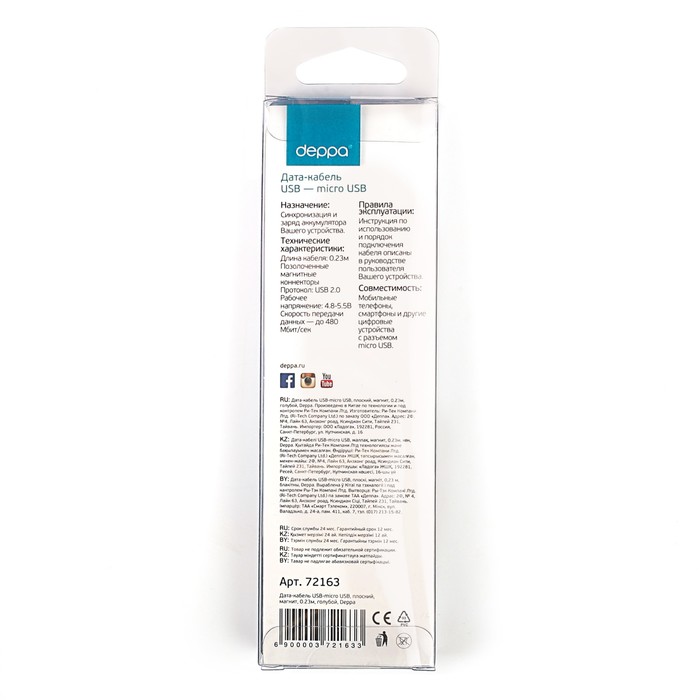 Кабель Deppa магнит micro USB 0,23м, плоский, голубой — это аксессуар, который увеличивает функциональность компьютера или другого прибора, подключая интерфейсы смежных устройств.
