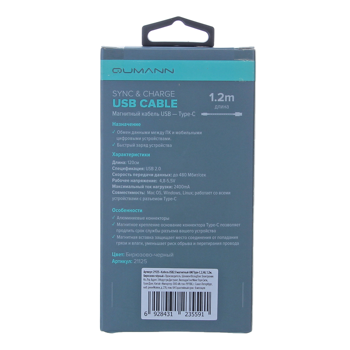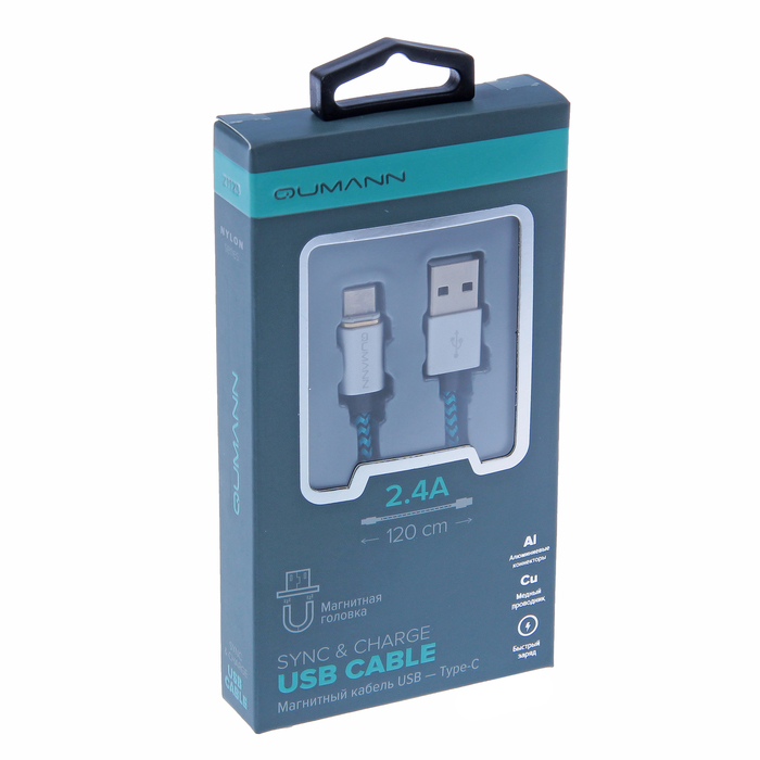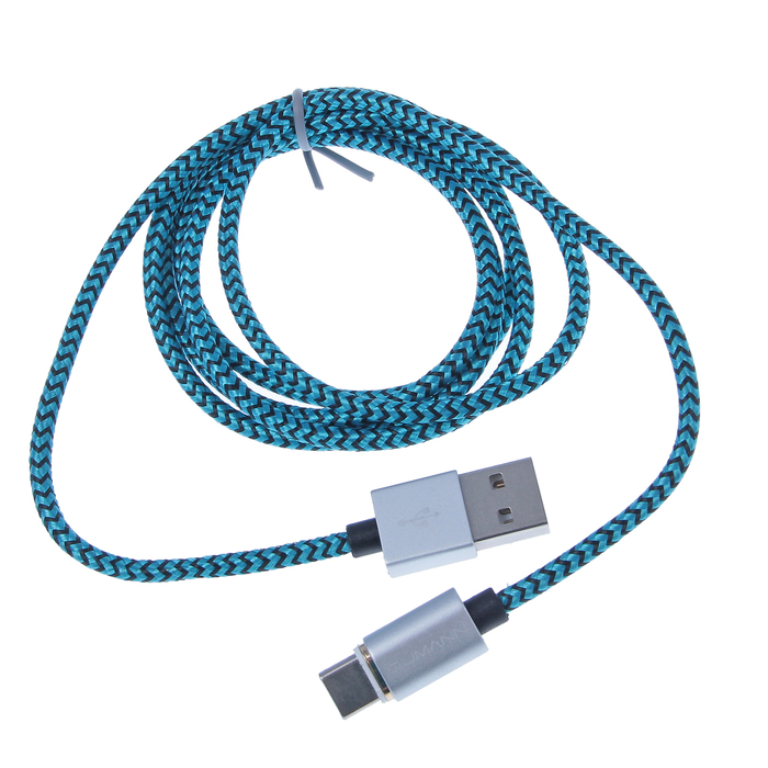 Кабель магнитный USB2.0 Qumann USB-Type-C 1,2м 2,4А нейлон/цинк бирюзово-чёрный