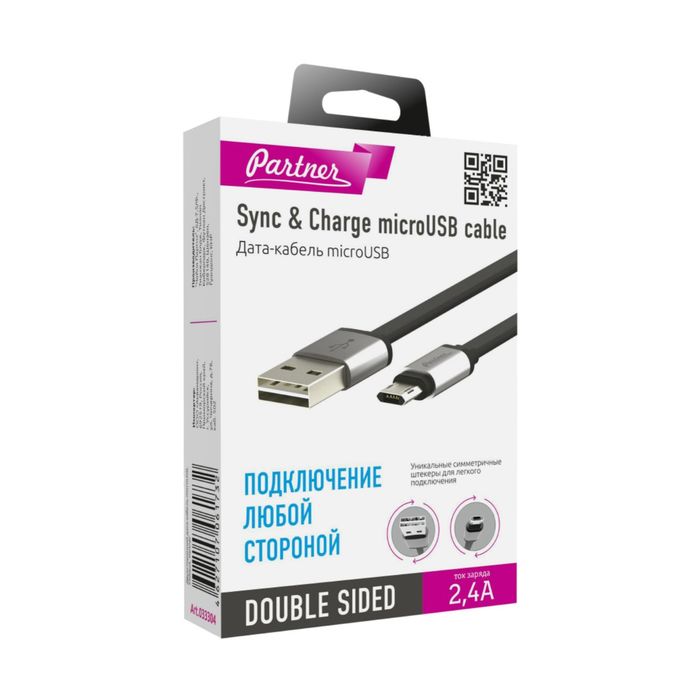 Кабель Partner (033304) двухсторонний micro USB, 2,4A, плоский — это аксессуар, который увеличивает функциональность компьютера или другого прибора, подключая интерфейсы смежных устройств.