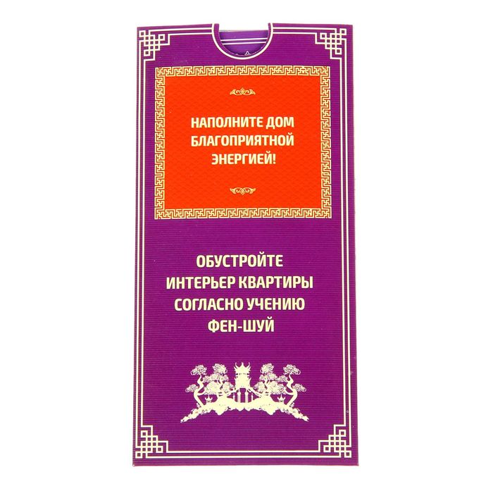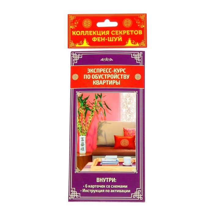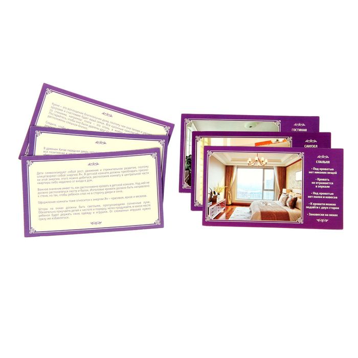 В конверте вы найдёте 6 карточек с каждой комнатой вашего дома. На одной стороне есть изображение комнаты с рекомендациями по её обстановке, а на другой — памятка по фэншуй. Все советы не требуют глобальных изменений в интерьере. Но даже если вы просто передвинете торшер из более светлого угла в тёмный, поверьте, положительные перемены не заставят себя ждать.