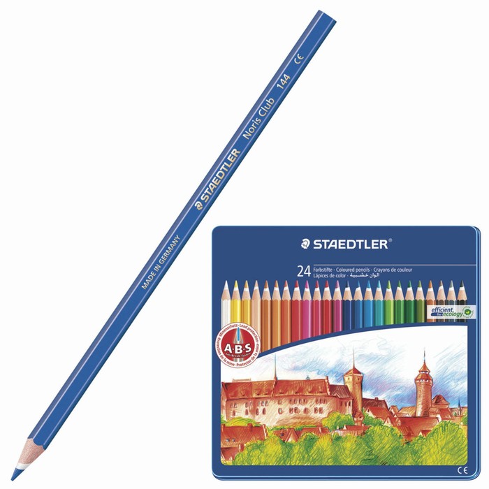 Карандаши 24 цвета Staedtler Noris Club, заточенные, в металлическом пенале поможет организовать ваше рабочее пространство и время. Востребованные предметы в удобной упаковке будут всегда под рукой в нужный момент.