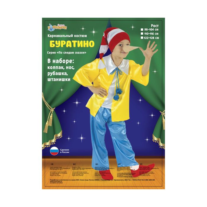 Костюм свободного покроя не сковывает движений — отлично подойдёт для танцевальных номеров. В образе Буратино можно смело отправляться на детский утренник, тематическую вечеринку или театральную сцену.