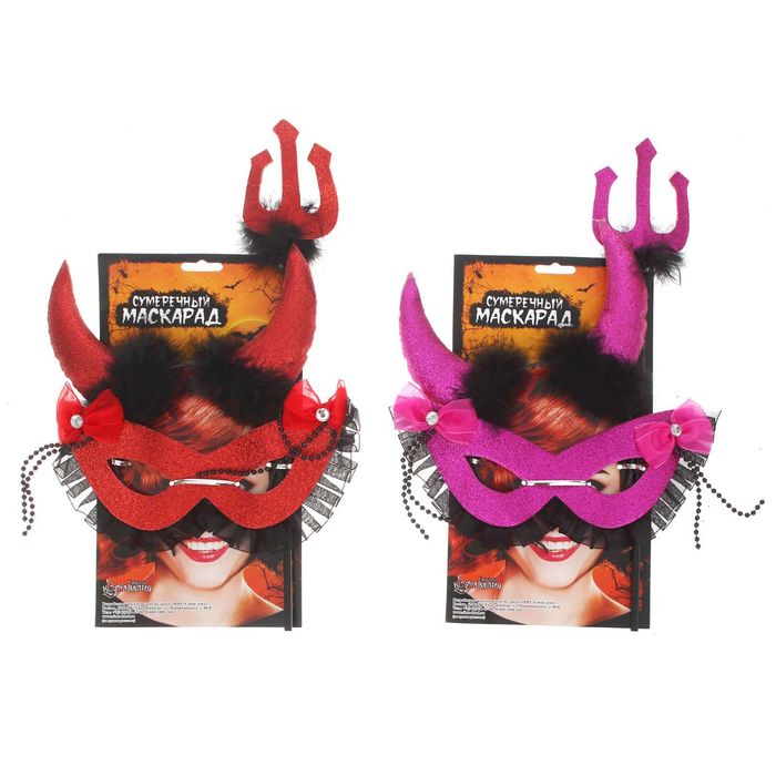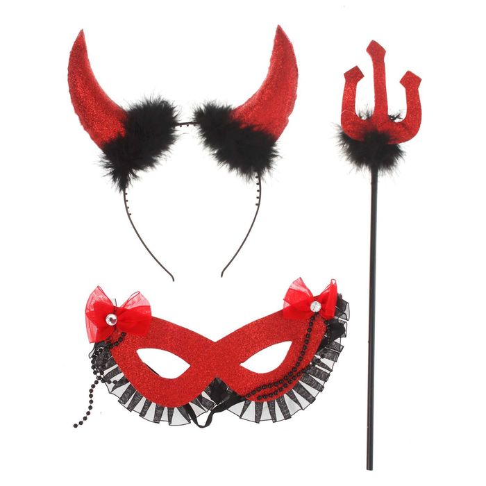 Карнавальный набор "Чертовка" 3 предмета: ободок, маска, трезубец, цвета МИКС создаст яркий образ на вечеринке с переодеванием. Эффектные атрибуты дополнят маскарадный костюм и сделают ваш облик самым выразительным и стильным. Такие символичные аксессуары незаменимы для Хэллоуина, ярких встреч с друзьями и других тематических праздников. Они добавят необходимые нотки мистики и таинственности и точно выделят вас из толпы.