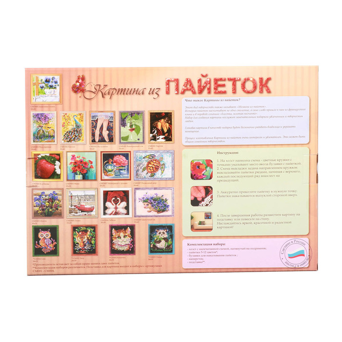 Мастерицы оценят необычный набор для создания картины из пайеток! Сверкающие яркие детали сделают изображение объёмным и глубоким, а сам процесс выкладывания мозаики позволит успокоить ум и остановить беспорядочное течение мыслей.