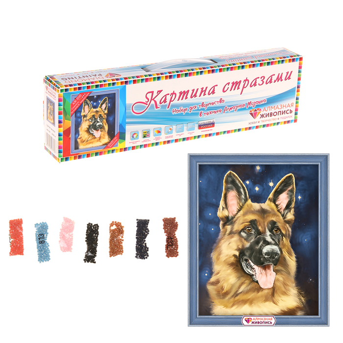 Может быть, именно такой необычный товар, как Картина стразами "Портрет овчарки", раскроет неожиданные способности у вашего ребёнка. И даже если он не станет новым Рафаэлем, то ему, определённо, обеспечена богатая фантазия, креативное мышление и золотые руки.