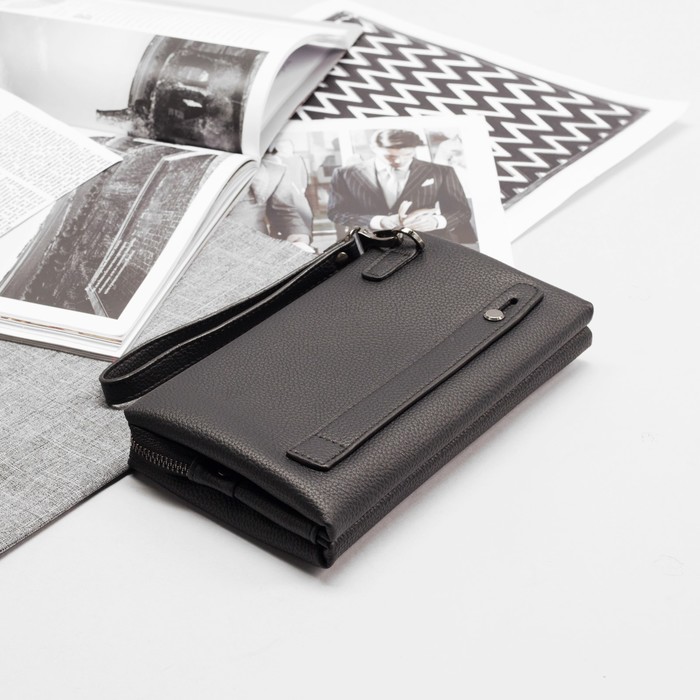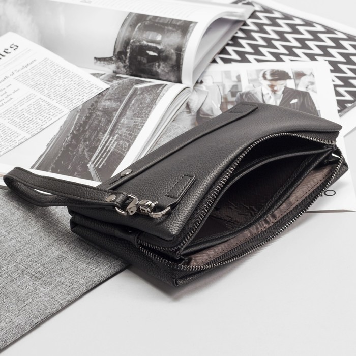 Клатч мужской, 3 отдела на молнии, хлястик, с ручкой, цвет чёрный