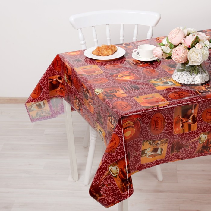 Скатерть изготовлена из высококачественного поливинилхлорида, который наносится на нетканые материалы. Особые параметры позволяют сделать клеёнку очень прочной и надёжной. Она отличается водонепроницаемостью и стойкостью к загрязнениям. ПВХ делает скатерть максимально простой в уходе. Любая грязь устраняется быстро: с помощью простой влажной тряпочки вы без особых усилий приведёте стол в порядок.