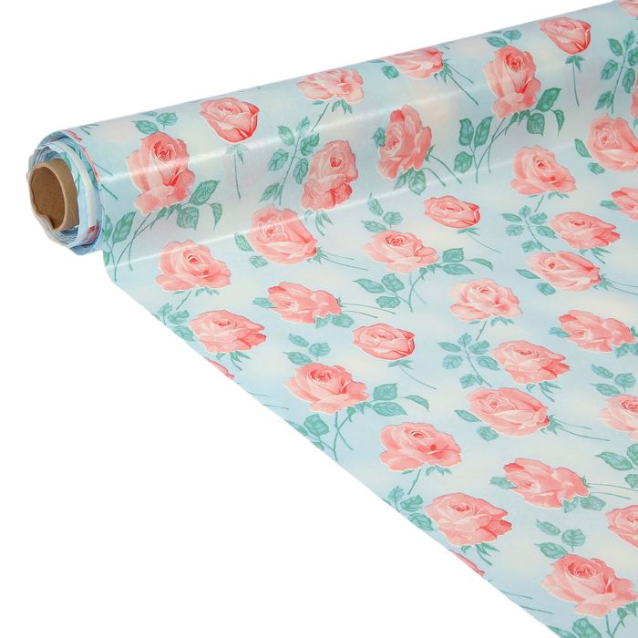 Клеенка столовая на ткани, ширина 125 см "Роза на голубом", рулон 25 м