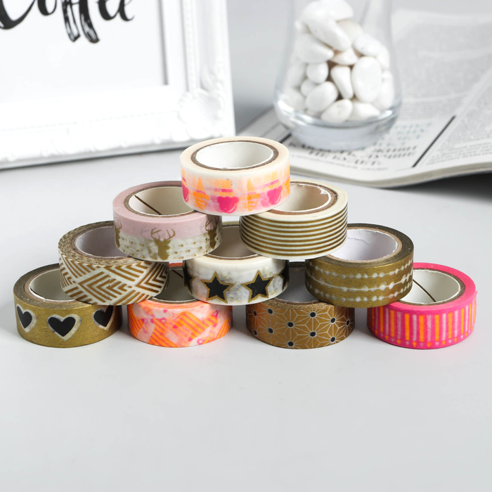 Клейкая лента декоративная бумажная "Рисунки на золотом" 1,5 см намотка 5 метров МИКС
