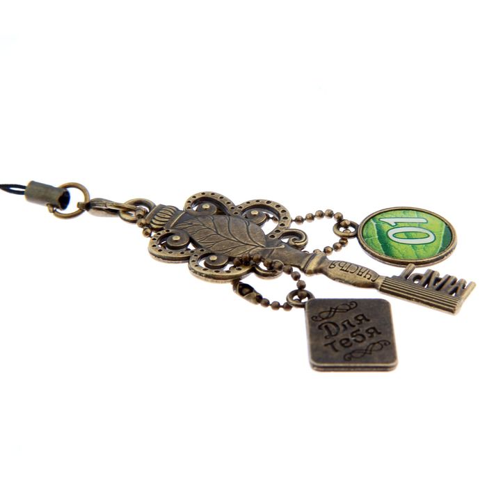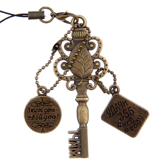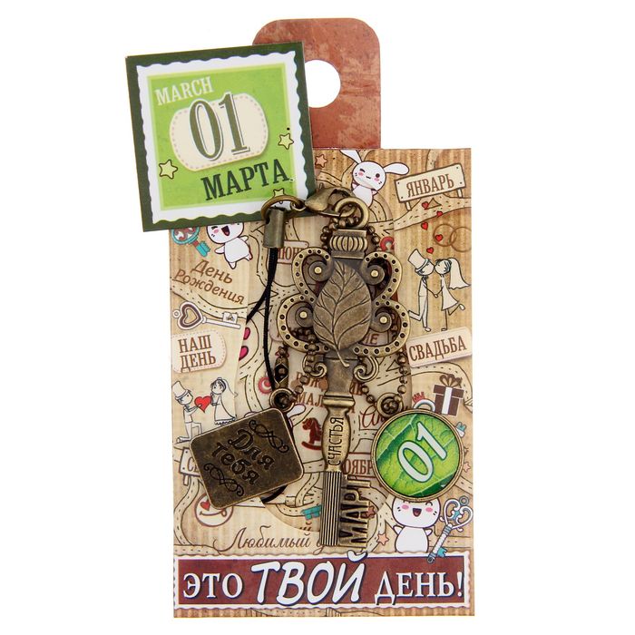 На ключике указан день и месяц, а на стержне красуется надпись «Счастья» и висит брелок с пожеланиями.