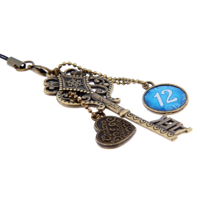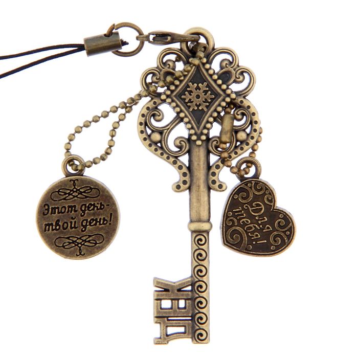 На ключике указан день и месяц, а на стержне красуется надпись «Счастья» и висит брелок с пожеланиями.