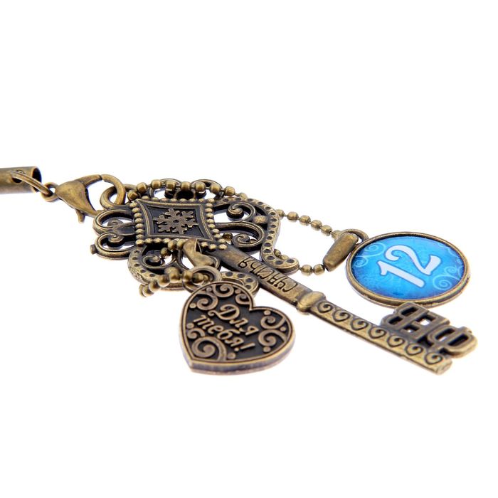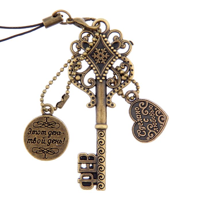 На ключике указан день и месяц, а на стержне красуется надпись «Счастья» и висит брелок с пожеланиями.