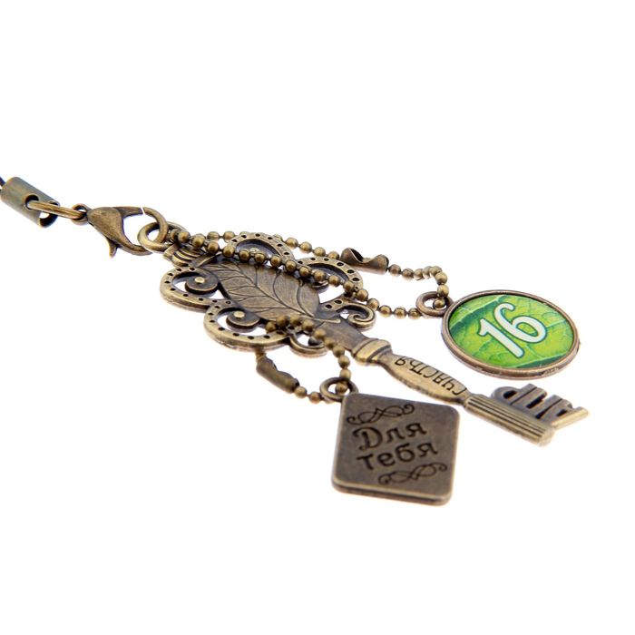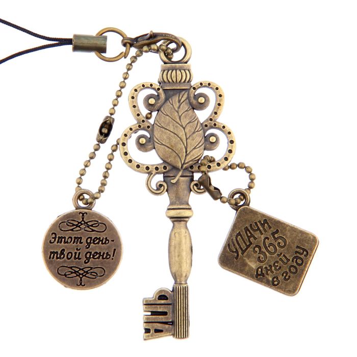 На ключике указан день и месяц, а на стержне красуется надпись «Счастья» и висит брелок с пожеланиями.