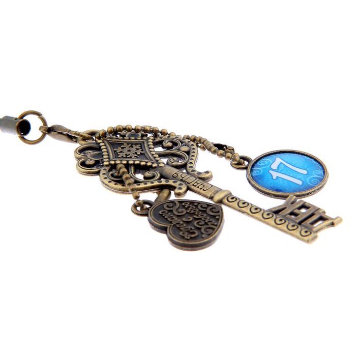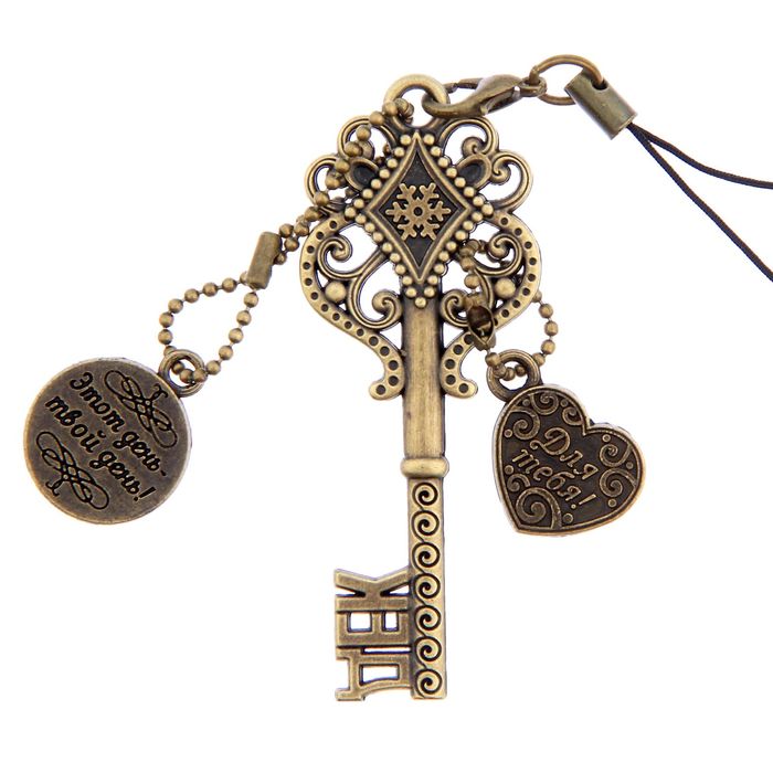 На ключике указан день и месяц, а на стержне красуется надпись «Счастья» и висит брелок с пожеланиями.