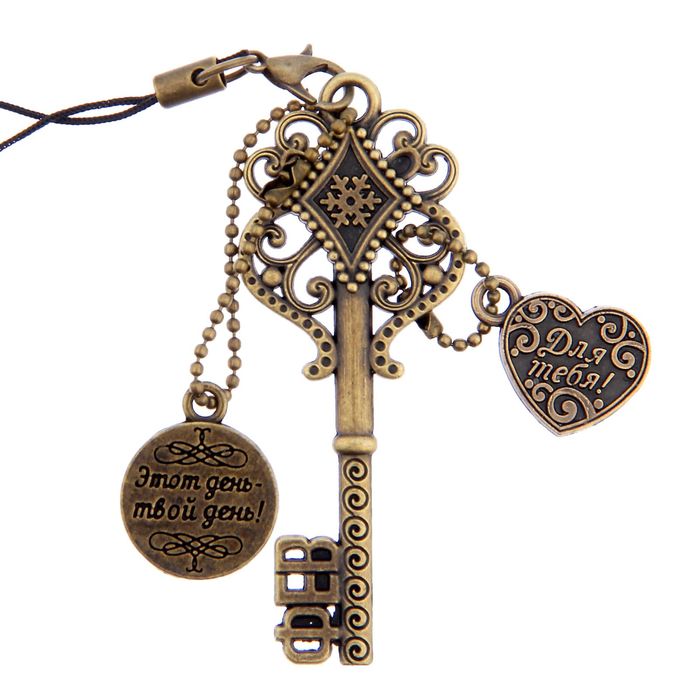 На ключике указан день и месяц, а на стержне красуется надпись «Счастья» и висит брелок с пожеланиями.