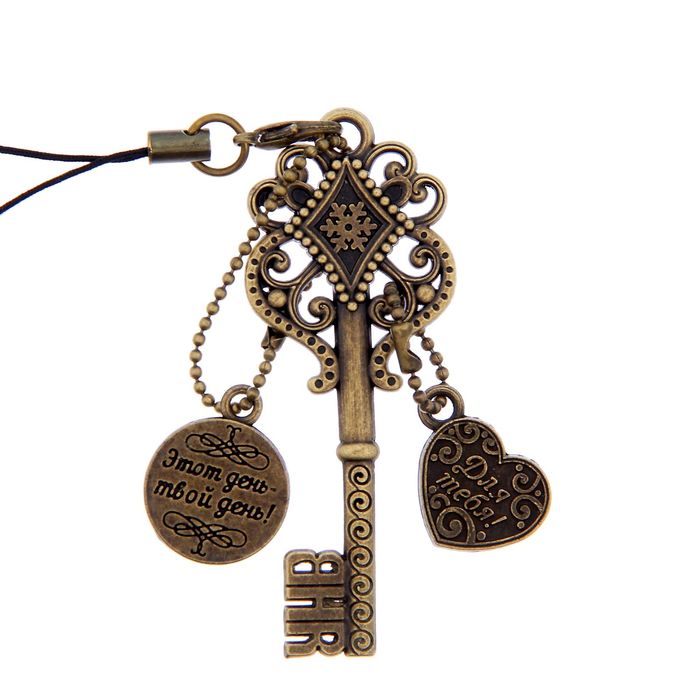 На ключике указан день и месяц, а на стержне красуется надпись «Счастья» и висит брелок с пожеланиями.