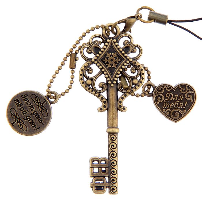 На ключике указан день и месяц, а на стержне красуется надпись «Счастья» и висит брелок с пожеланиями.