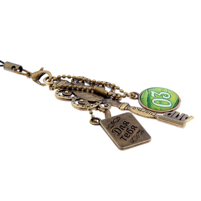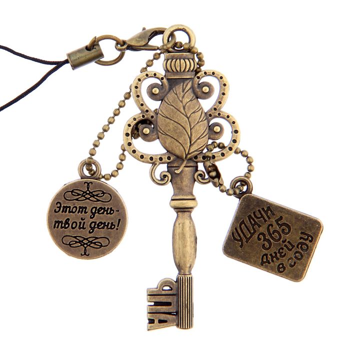 На ключике указан день и месяц, а на стержне красуется надпись «Счастья» и висит брелок с пожеланиями.
