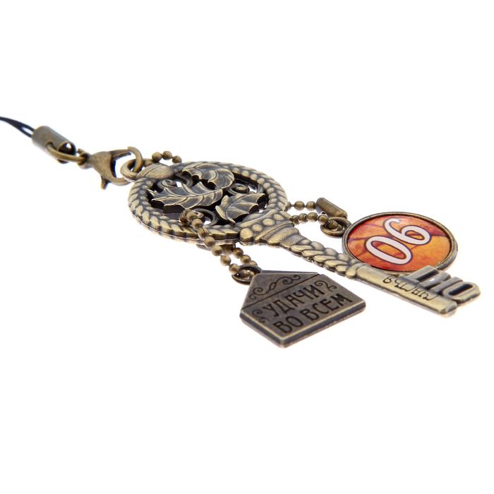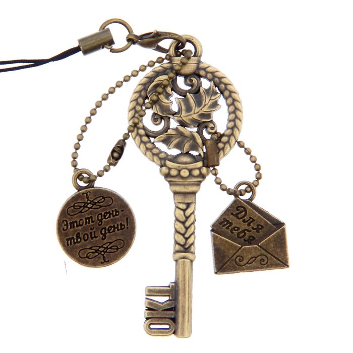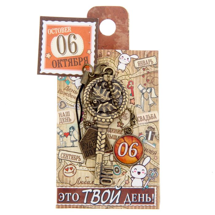 На ключике указан день и месяц, а на стержне красуется надпись «Счастья» и висит брелок с пожеланиями.