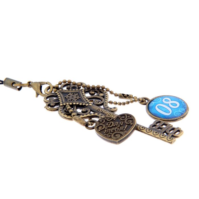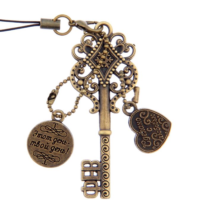 На ключике указан день и месяц, а на стержне красуется надпись «Счастья» и висит брелок с пожеланиями.