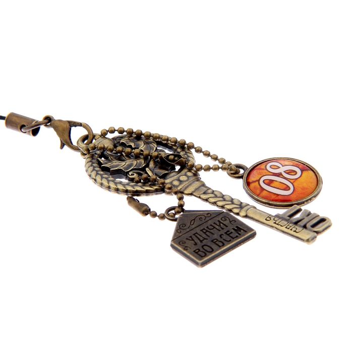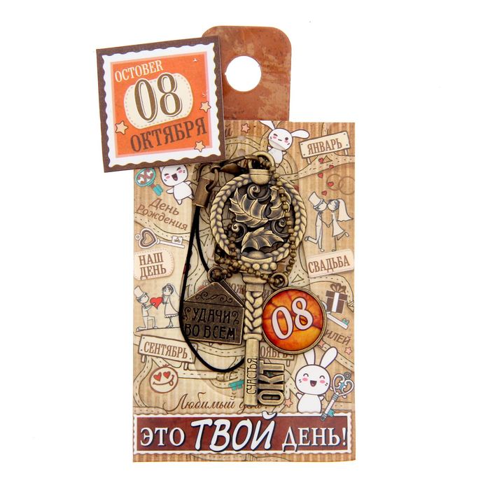 На ключике указан день и месяц, а на стержне красуется надпись «Счастья» и висит брелок с пожеланиями.