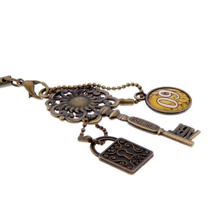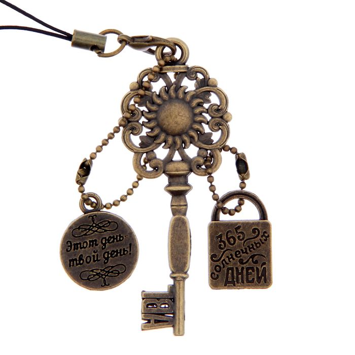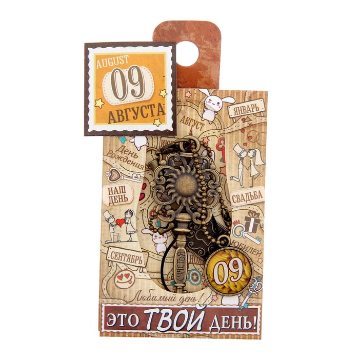 На ключике указан день и месяц, а на стержне красуется надпись «Счастья» и висит брелок с пожеланиями.
