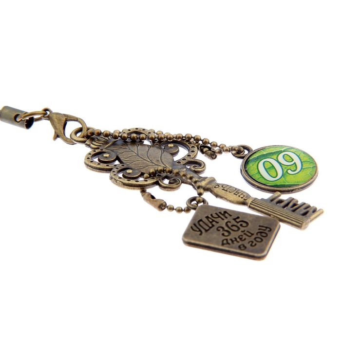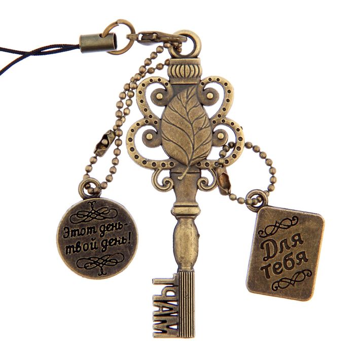 На ключике указан день и месяц, а на стержне красуется надпись «Счастья» и висит брелок с пожеланиями.