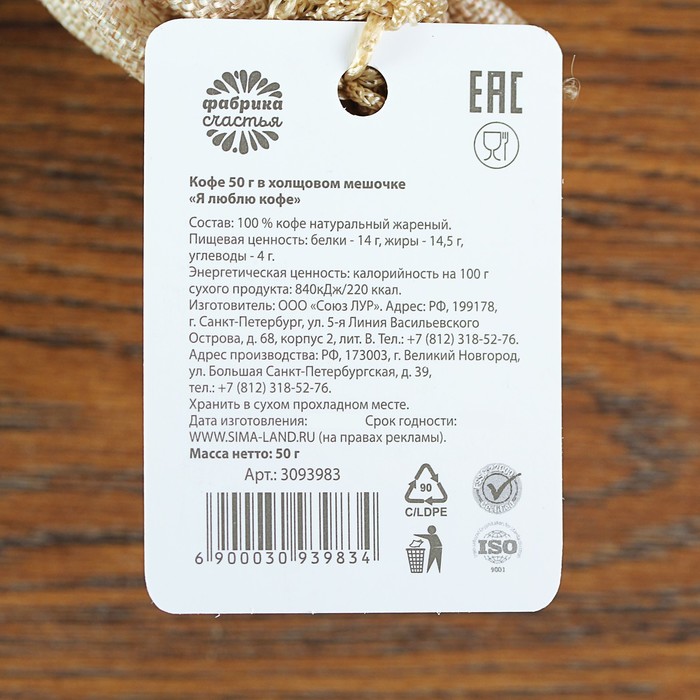 Кофе 50 г в холщовом мешочке "Я люблю кофе"