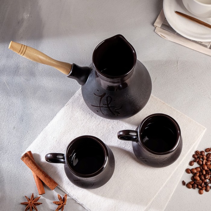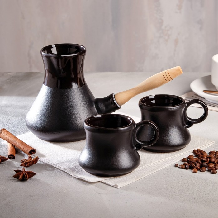 Кофейный набор 3 предмета, чёрный, матовый, турка с деревянной ручкой, объём 0,6 л, чашка 0,1 л