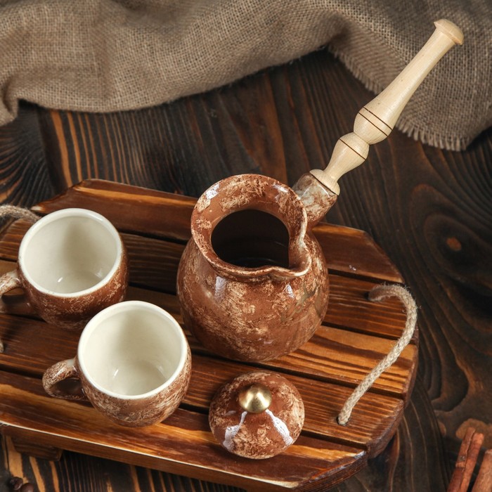 Все предметы набора изготовлены вручную из керамики. Этот экологически чистый материал легко переносит высокие и низкие температуры, устойчив к царапинам, потёртостям, не имеет запахов и примесей. Керамическая посуда хорошо держит тепло напитка, не влияя на его вкус.