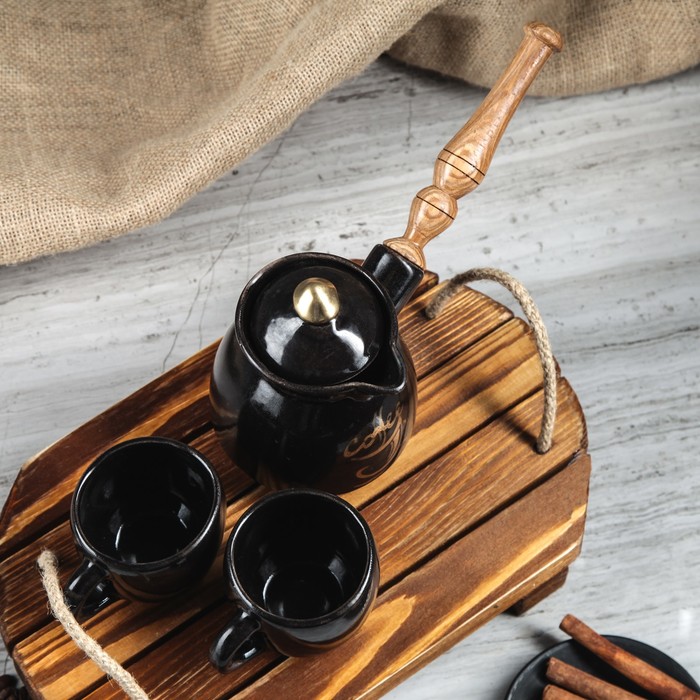 Все предметы набора изготовлены вручную из керамики. Этот экологически чистый материал легко переносит высокие и низкие температуры, устойчив к царапинам, потёртостям, не имеет запахов и примесей. Керамическая посуда хорошо держит тепло напитка, не влияя на его вкус.