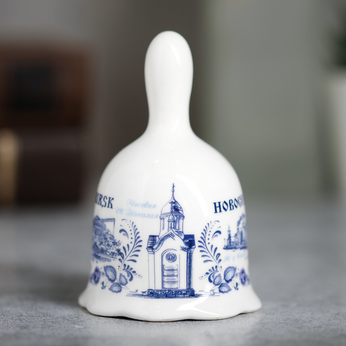Нежный колокольчик «Новосибирск» в традиционном русском стиле под гжель изготовлен из белоснежной керамики с тончайшим нанесением изображений основных достопримечательностей города: светлой часовни Святого Николая, крупнейшего Новосибирского государственного академического театра оперы и балета, живописного железнодорожного вокзала.