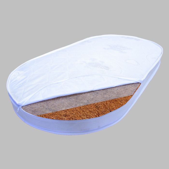 В матрасе используется кокосовая койра, которая пропускает воздух, не гниёт, не впитывает запахи и влагу. Благодаря такому материалу одна половина данной модели жёстче второй. Новорождённого располагайте на мягкой стороне, а когда позвоночник малыша окрепнет, переверните изделие.