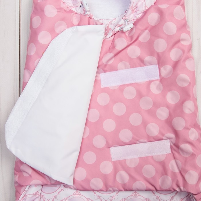 - Конверт нежной расцветки, украшенный эксклюзивным принтом. Синтепон плотностью 100 г/м², который используется в качестве утеплителя, согреет дитя, ткань верха Dewspo защитит от непогоды, а хлопковый подклад позаботится о том, чтобы нежная кожа новорождённого дышала. Чтобы кроху не продуло, предусмотрены эластичная утяжка на капюшоне и ветрозащитная планка.