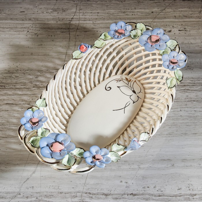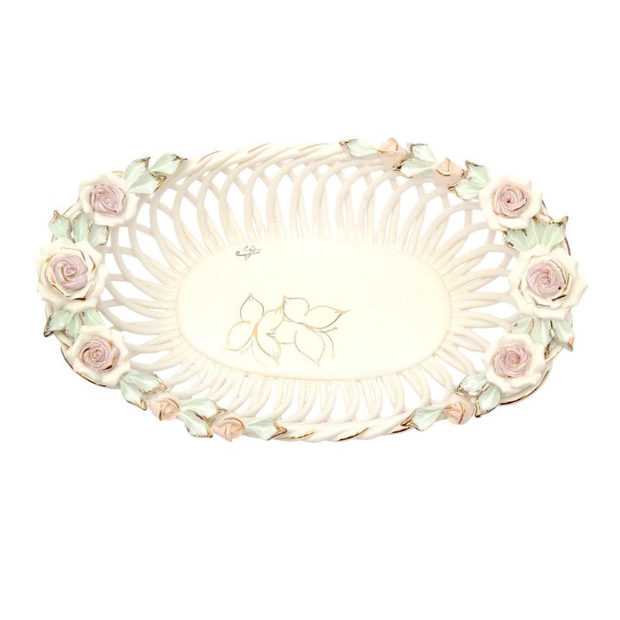 Ваза для конфет выполнена из фарфора белого цвета. Её стенки декорированы плетением. Изделие оформлено изящной лепкой в виде цветочной композиции с золотым обрамлением.