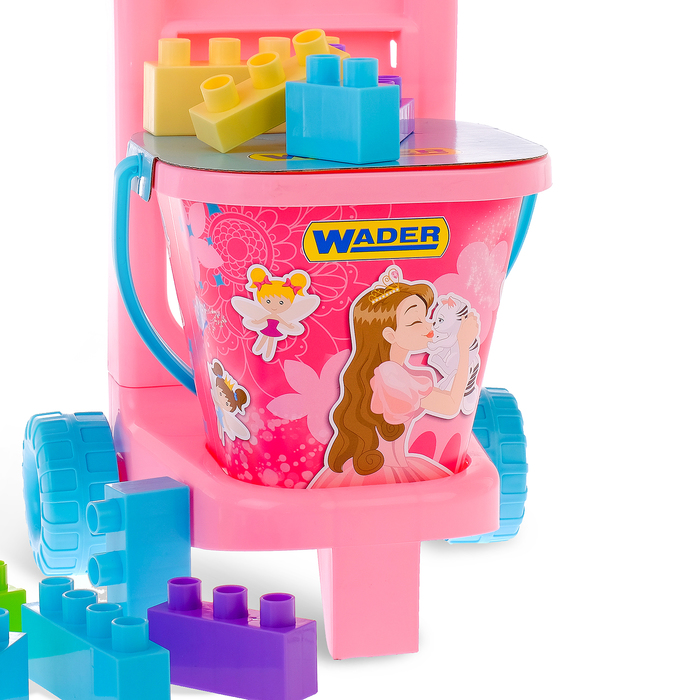 Розовая тележка с красивым ведёрком и красочным конструктором понравится любой девочке! Верхняя полочка тележки регулируется по высоте и имеет высокие бортики, поэтому во время движения груз не выпадает из неё.