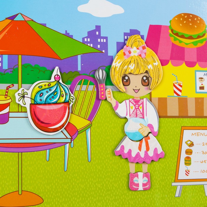 Помогите девочке отправиться на незабываемый пикник! Подберите красивый наряд, создайте причёску, дополните образ аксессуарами. Карточки с подсказками помогут сориентироваться в разнообразии предметов одежды. Обсудите с ребёнком элементы костюма, их предназначение и уместность в определённых ситуациях. Не забудьте придумать для девочки меню и выбрать необходимые блюда.