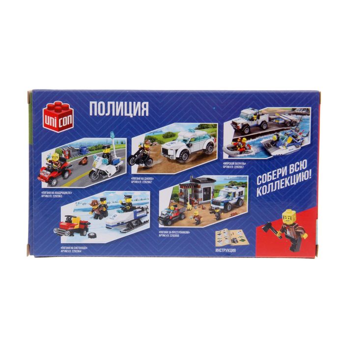 Благодаря полицейскому вертолёту торговой марки Unicon юный страж порядка отследит злоумышленника с воздуха. Манёвренный летательный аппарат полностью повторят конструкцию реалистичной авиамодели, его лопасти вращаются, на хвостовой балке расположен рулевой винт, в кабине пилота предусмотрено место для одной мини-фигурки.