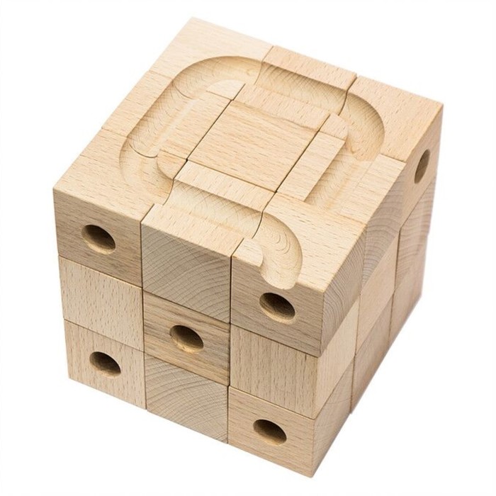 Конструктор изготовлен из натурального бука. Материал экологически чистый и безопасный для здоровья детей. Детали выполнены в виде кубиков с отверстиями и прорезями, по которым скатываются стеклянные шарики.