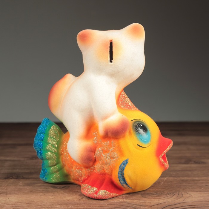 Копилка — универсальный вариант подарка любому человеку, ведь каждый из нас мечтает о какой-то дорогостоящей вещи и откладывает или собирается откладывать деньги на её приобретение. Вместительная Копилка "Кот на рыбке" флок, микс станет прекрасным хранителем сбережений и украшением интерьера. Она выглядит так ярко и эффектно, что проходя мимо, обязательно захочется забросить пару монет.