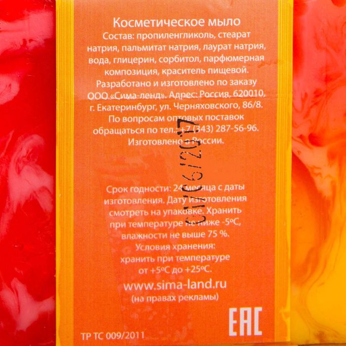 * Состав: пропиленгликоль, стеарат натрия, пальмитат натрия, лаурат натрия, вода, глицерин, сорбитол, парфюмерная композиция, краситель пищевой.