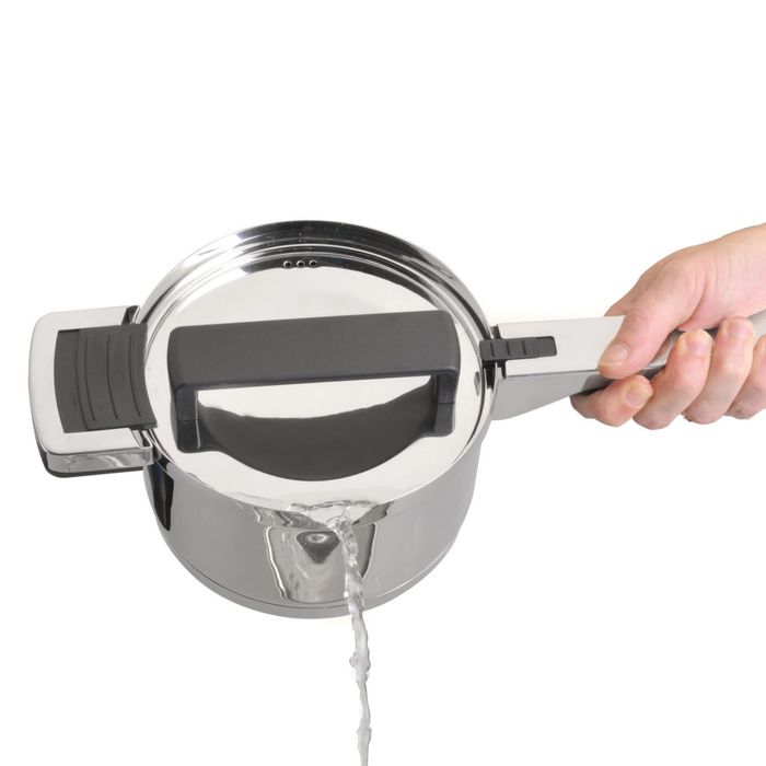 Такой ковшик — это функциональная посуда, выполненная из нержавеющей стали. Специальная защёлка закрепляет крышку на корпусе и обеспечивает лёгкий слив. Три вентиляционных отверстия предотвращают выплёскивание при кипении. Ручки из пластика не нагреваются при приготовлении пищи.