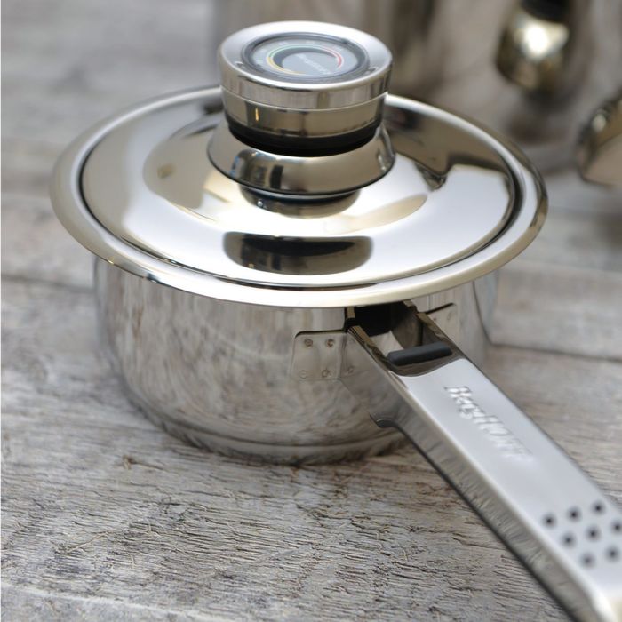 Крышка кастрюли сохраняет тепло внутри, а три вентиляционных отверстия пароотвода предотвращают выплёскивание жидкости на плиту. Вы можете наблюдать за приготовлением блюда через прозрачное стекло. Ручка с термодатчиком позволит контролировать температуру пищи.