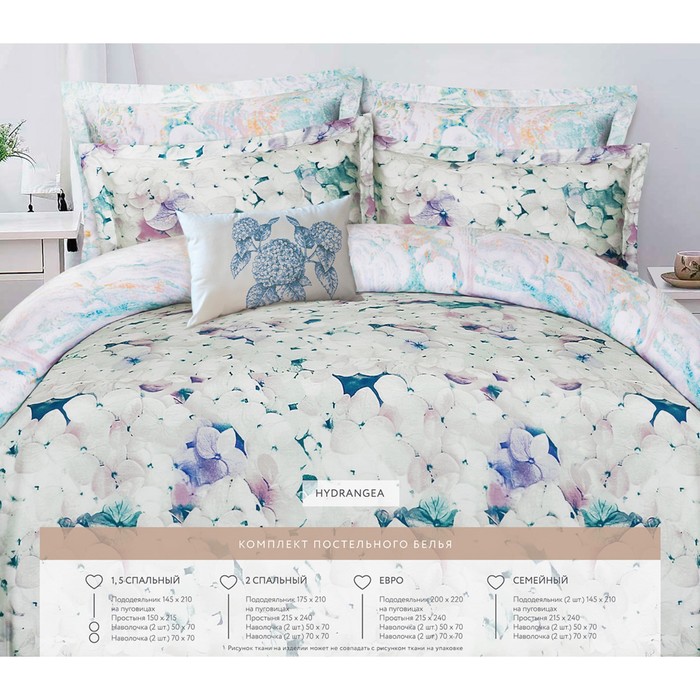 КПБ Hydrangea дуэт, 240×260 см, 145×210 см-2 шт, 50×70 см, 70×70 см по 2 шт, сатин